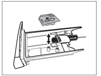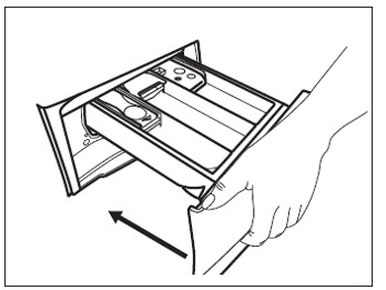 Kai kurių modelių skalbyklėse, norint ištraukti stalčių, reikia nuspausti skląstį, kaip nurodyta paveikslėlyje.